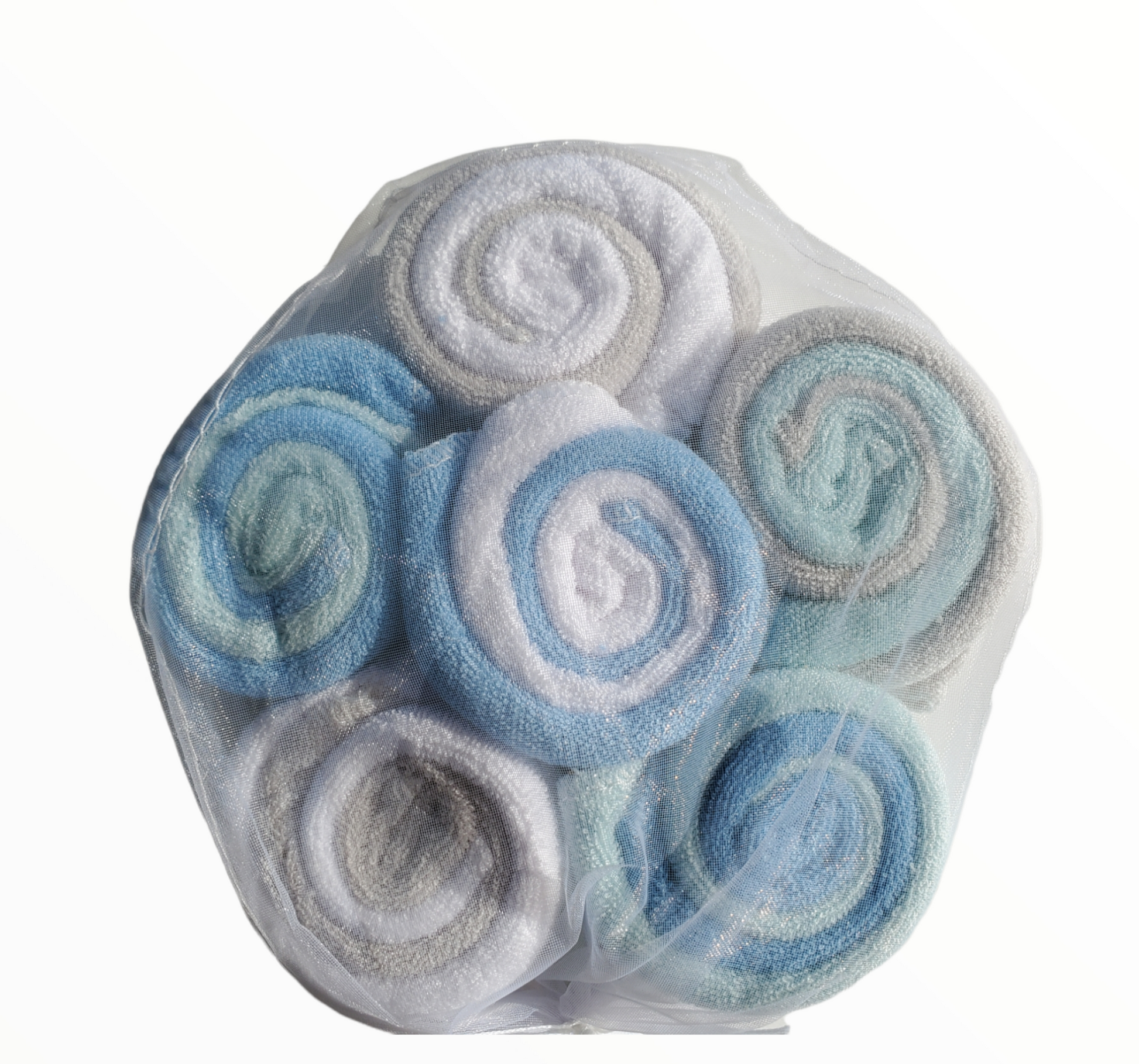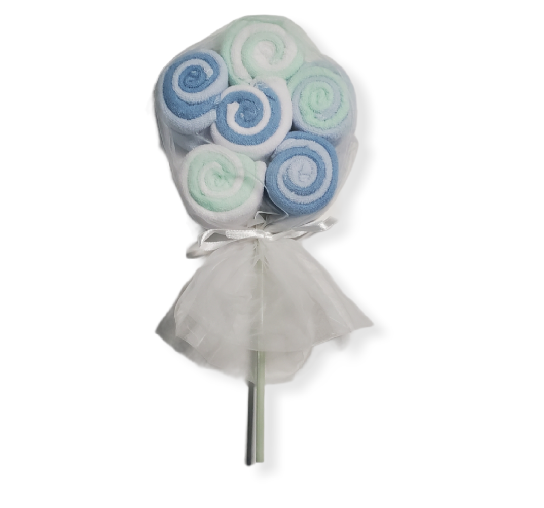 Washcloths in a shape of a lollipop. A great gift for a baby shower. Consist of 12 pack of washcloths. Two different sets of color. One has 3 light blue, 3 white, 3 gray, 3 blue and the other one has 3 white, 3 blue, 3 aqua, and 3 baby blue. Washcloth size 24cm x 23cm, 60% cotton, 40% polyester.